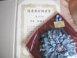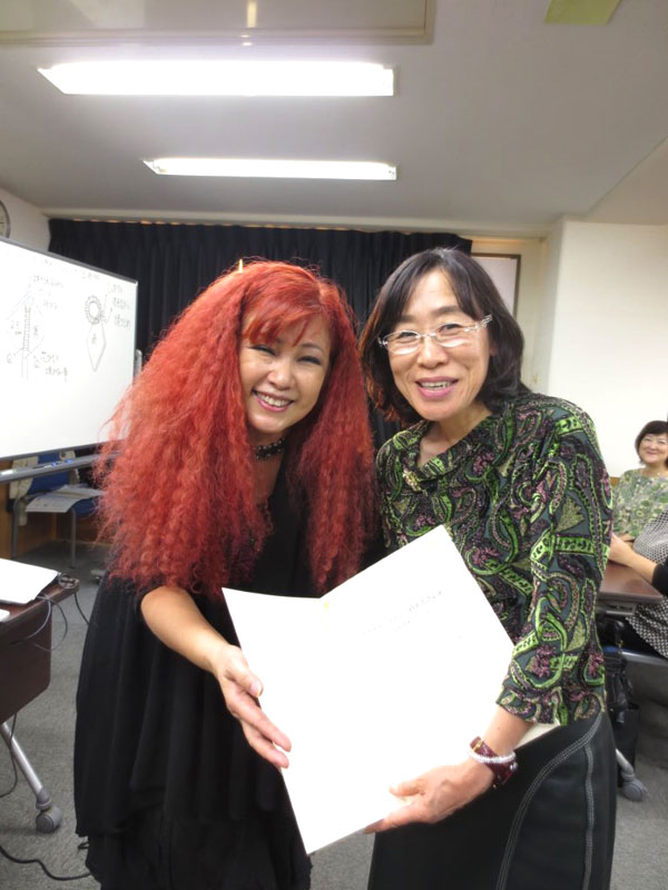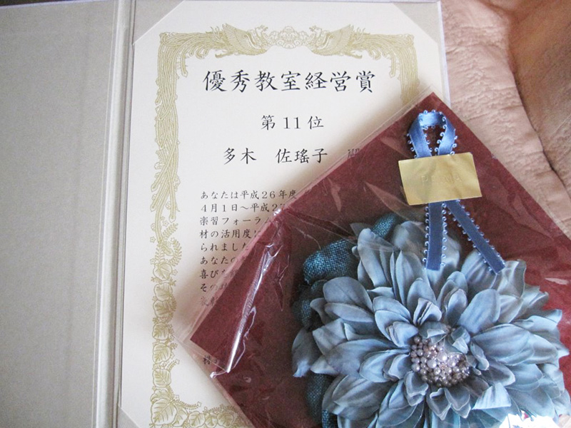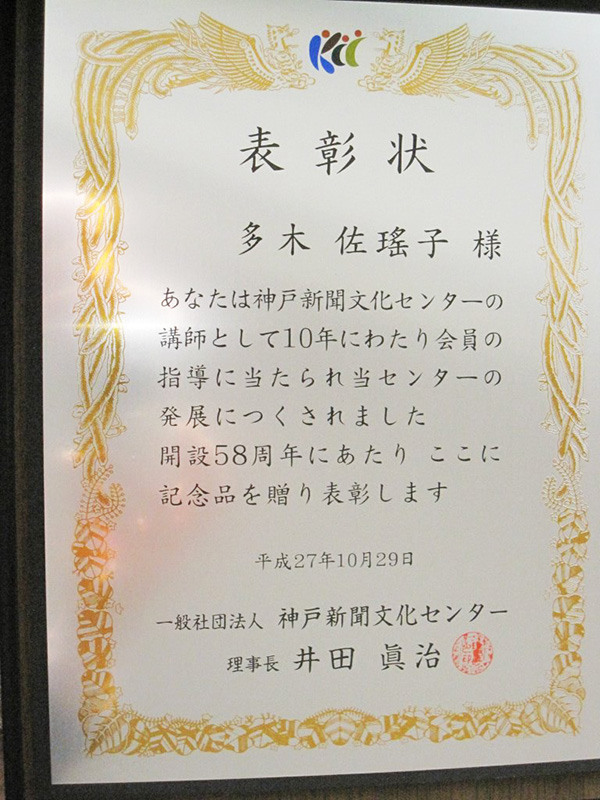 コスチュームジュエリーアワード2015で特別賞 (株)ブティック社賞ジャパンウェディング部門を頂きました。表彰式会場は青山です。 もう一つの作品も佳作を頂きました。 佳作の授与、渡辺先生から頂きました。 昨年は愛犬の病気もありコンテストには出していなかったのですが、亡くなった悲しみも乗り越えたい気持ちもあり挑戦致しました。 そして渡辺先生、日柳先生の講習会に参加させていただく事も出来、その中で学ばせて頂いたことが大きかったととても感謝致しております。 賞を頂けました事、心よりうれしく思っております。 これからも作品作りに時間をかけてまいりたいと思っております。 青山の表彰式会場近くでヘリンボーンクロッシェの考案者の先生HANA先生がお仲間と展示会をされていたのでお邪魔致しました。 桂由美先生の50周年記念の展示会とファッションショーが日本橋三越でございました。 ランチ会に参加させていただきました。 お忙しい中、桂先生がご出席くださり、先生の貴重なお話を聞かせて頂き勉強になり刺激を受けて帰ってまいりました。 現在お世話になっておりますカルチャーセンター様でお仕事をさせていただくようになってから早10年になりました。表彰式とパーティーには出席はできませんでしたが、このような楯と記念品を頂きました。 現在もそして以前ご在籍いただきました多くの生徒様にはこころより感謝申し上げます。 これからもより一層楽しいお教室づくりを心掛けてまいります。 11月29日(日)に神戸新聞カルチャーセンター三宮で文化祭がございます。 お時間ございましたら覗いてみてください。 デコ巻寿司のマイスターになりました。 巻き終えて切った瞬間の感動! 一度お試ししてみてくださいね。 お味もとても美味しかったです。お問い合わせしてみてくださいね。 私が白い間に姫路城を見たいと言ったので、皆様と登ってまいりました。まだ白かったです。 この夏お友達から頂いた日本100名城スタンプ帳にスタンプ押してまいりました。 頂いたのが旅行先での五稜郭・・・現在2つです・・・。 名古屋や東京には講習会に参りますが、なかなかお城まで足を運ぶことがないので、二けたに行くにはかなりかかりそうですね。次は明石城か赤穂城かな。